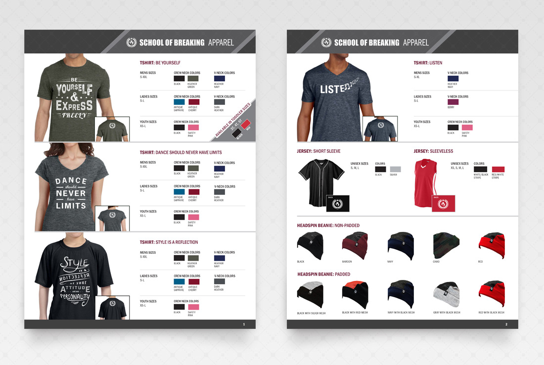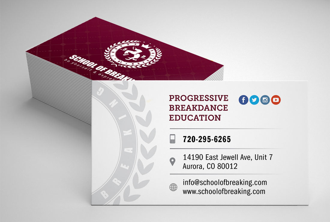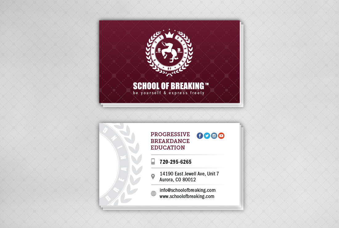 Brand collateral design for School of Breaking, a breakdancing studio based in Colorado.